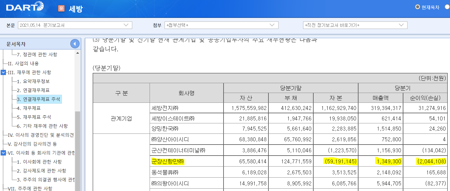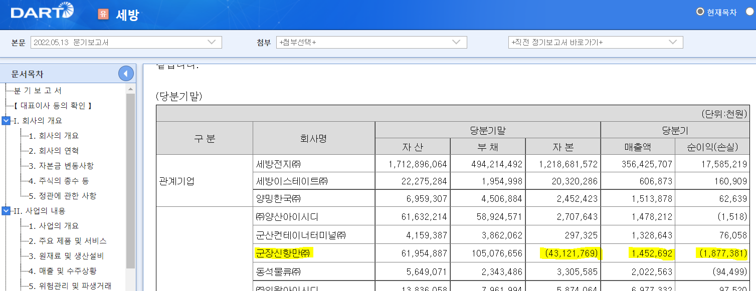 여기까지는 좋습니다. 그렇다면 이제 세방의 오랜 골치덩어리인 군장신항만의 실적을 확인해야 합니다. 군장신항만은 세방이 지분 38%, CJ대한통운이 37%, 리드트리제일차가 25%를 가지고 '06년에 설립한 항만사로, 설립 이래 한 번도 흑자를 낸 적이 없는 회사입니다. 오죽 답답했으면 한국밸류자산운용이 '20년 즈음에 이 회사 정리 좀 하라고 주주서한을 보내기도 했습니다만 받아들여지지 않은 것으로 보입니다.