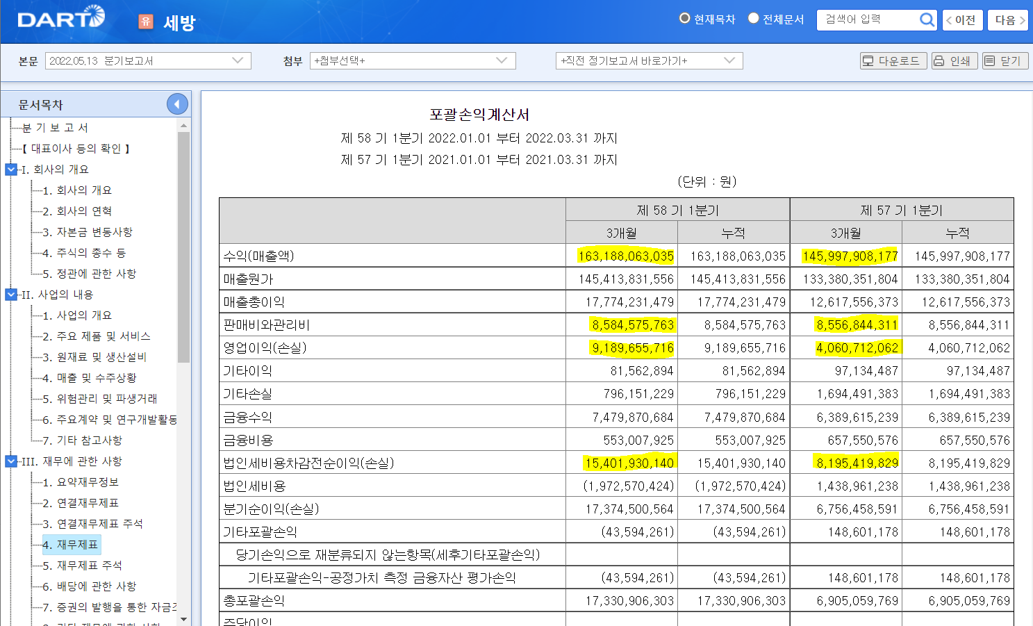 위 주석내용을 보면 세방전지의 실적도 확인할 수 있는데, 전년 동기 대비 매출액은 늘었지만 순이익은 거의 반토막 가까이 나버렸네요. 원자재 가격 상승분을 판가에 온전히 전가하지 못한 것으로 보입니다.