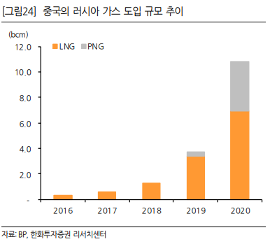 중국에서 러시아로 가는 파이프라인 Power of Siberia의 캐파는 60bcm 이고, 아직 미개통 상태인 Power of Siberia 2 (이하 "PoS 2")의 캐파는 50bcm 입니다. PoS 2가 개통되면 중국이 LNG 물량을 PNG로 일부 대체할 가능성이 있습니다.