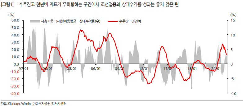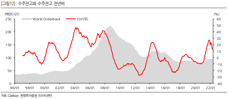 하락장 속에서 조선업종이 잘 버티더니 변동성이 커지고 있습니다. 리스크 요인을 점검해보고자 한화투자증권에서 나온 "다음 사이클, 빅 사이클에 만나요" (2022-06-13 / 이봉진) 리포트를 정리해봅니다. 이 리포트는 조선업종 주가 분위기가 한창 좋을 때 나홀로 찬물을 끼얹어서 눈에 띄었습니다. 내용을 보면 첫 단락만 안티였지 데이터와 전망은 사실상 바이콜을 말하고 있었습니다.