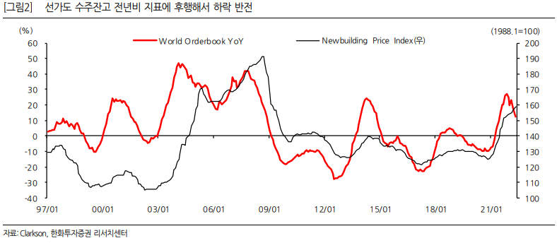 선가 상승세도 둔화될 수 있다고 하는데, 수주잔고 전년비 지표가 YoY 우하향하면 4~5개월 후 선가도 하락세로 전환한다고 합니다. 다음 그림을 보면 이미 올해초부터 수주잔고 전년비 지표는 꺾였는데 아직까지는 선가 상승세가 꺾이지 않았습니다. 하반기에 어떻게 될 지는 지켜봐야 겠지요.