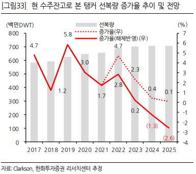 희망회로를 좀 돌려보자면, '25년부터 적용되는 탱커 EEDI 규제, 탱커 선복량 감소, '26년까지 거의 소진된 조선소 슬롯, 다시금 확인한 화학 연료 수요 등으로 탱커 전체 선종에 걸쳐 발주가 갑자기 쏟아져나올 수도 있습니다.