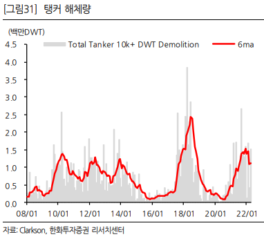 선박 해체량 증가에 따른 탱커 선복량 감소도 발주 기대감을 가져오는 주요 사안입니다. 올해 들어 철스크랩 가격이 많이 하락해 해체량도 꺾였지만 이 부분도 꾸준히 점검해볼만 합니다.