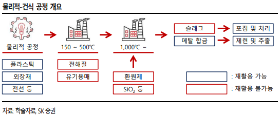 건식공정은 비교적 간단하고 기존 공정 개발 수준이 높아 공정 난이도는 낮지만, 용융로 가동 비용, 설비 감가상각비 부담이 있고 탄소발생량이 많다는 단점이 있습니다. 공정의 에너지 사용량도 습식 대비 2배 이상 많구요.