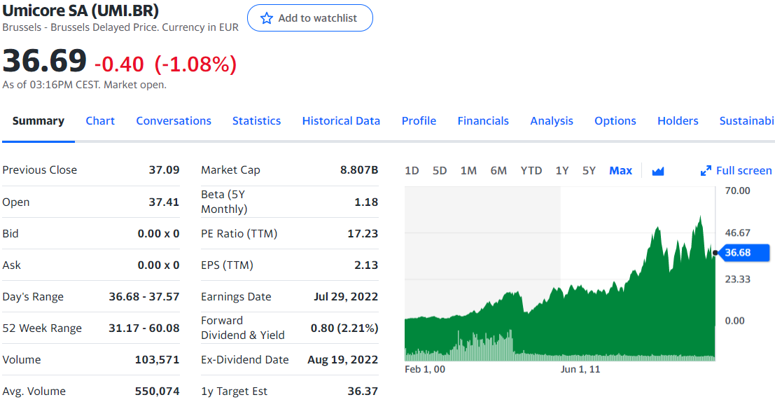 비싸게 살바에야 양극재 글로벌 1위이자 습식 공정의 선두주자 Umicore를 투자하는 게 나을지도 모릅니다. 그러나 벨기에 증시에 상장되어있어 투자하기가 좀 까다롭지요. 미국장에 ADR이 보이는 것 같긴 합니다만, 이게 상장된 ADR이 아닌 것 같아 역시 투자하기 번거로울 것으로 보입니다. 번거로움을 감수하고 투자할 가치가 있는지도 잘 생각해봐야겠지요.