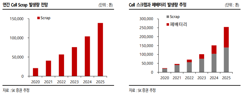 현재 리사이클링 시장의 주원료는 셀 스크랩(manufacturing scrap) 입니다. 셀 스크랩은 쉽게 말하면 배터리 제조 과정에서 발생하는 부스러기 정도로 보시면 되겠습니다. 배터리 수율 98% (스크랩 발생율 2%) 가정 시 '21년 기준 셀 스크랩은 약 4만톤 발생했습니다. 이게 '25년이 되면 14만톤까지 증가한다는군요.