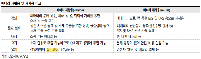 - NCM 대비 수명이 더 길다는 특성이 있어 재활용보다 재사용이 더 좋음