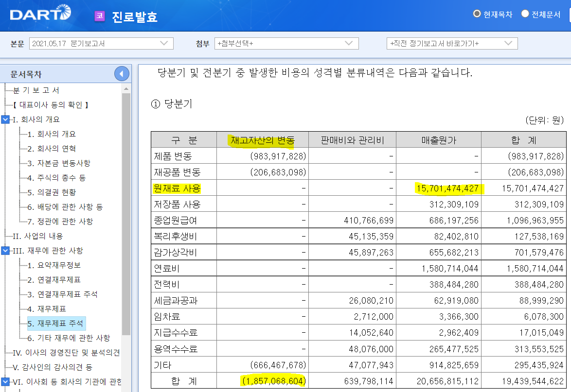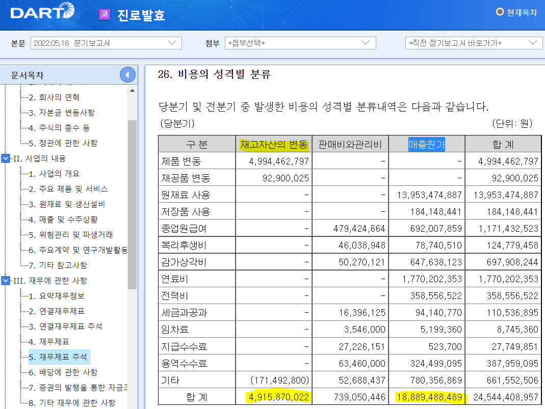 1Q21의 재고자산 변동이 (-) 이므로 당기에 제조한 양보다 제품이 적게 팔려 기초 대비 기말 재고가 더 많아졌음을 알 수 있습니다. 금액으로 보면 12억원(기타 제외) 정도네요. 매출원가 상의 원재료 사용금액을 비교하면 1Q22 140억원 / 1Q21 157억원으로 오히려 YoY 10% 가량 감소했습니다. 연료비 이외에는 비용 상승요인이 딱히 없어보입니다.