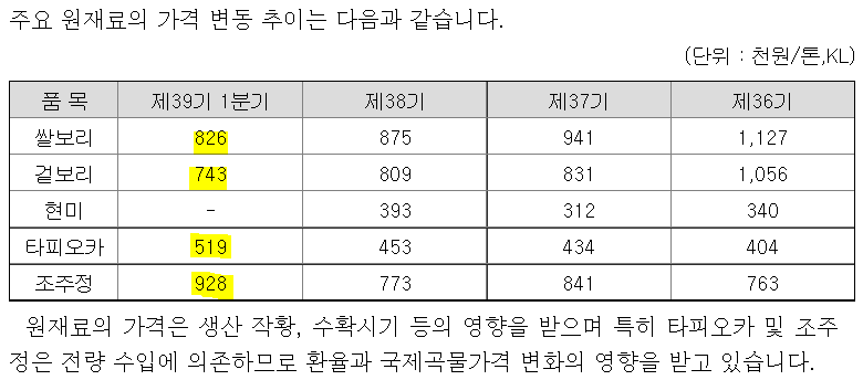 오르긴 올랐으나 매출원가 YoY 26% 상승을 설명하기에는 부족합니다. 조주정이 20% 정도 오르긴 했습니다만 또 하나의 주원료인 타피오카는 10% 정도 올랐습니다.