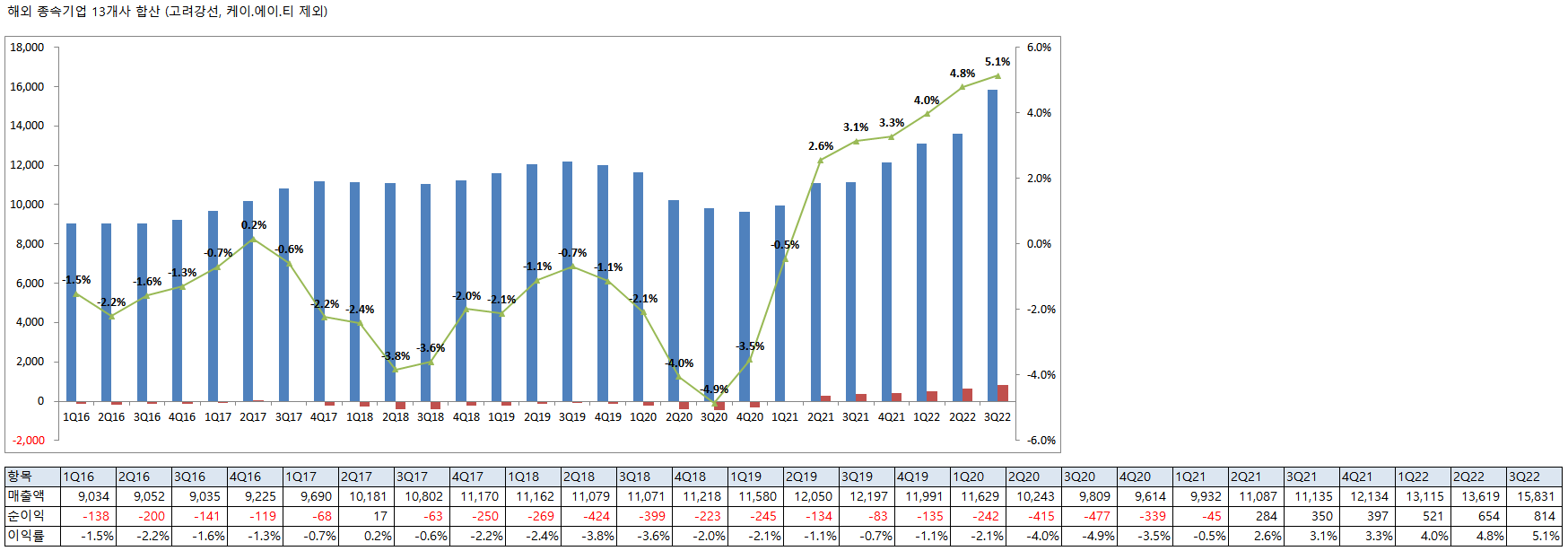 이제 해외 종속기업 13개사 합산 실적을 보겠습니다. 매출과 순이익률 모두 증가하는 모습 입니다.