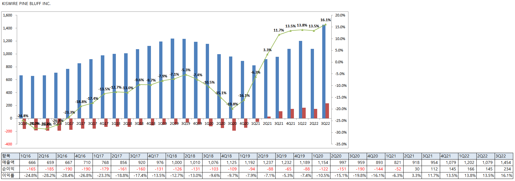 선재를 취급하는 법인 KISWIRE PINE BLUFF INC. 의 수익성 개선이 이어지고 있습니다.
