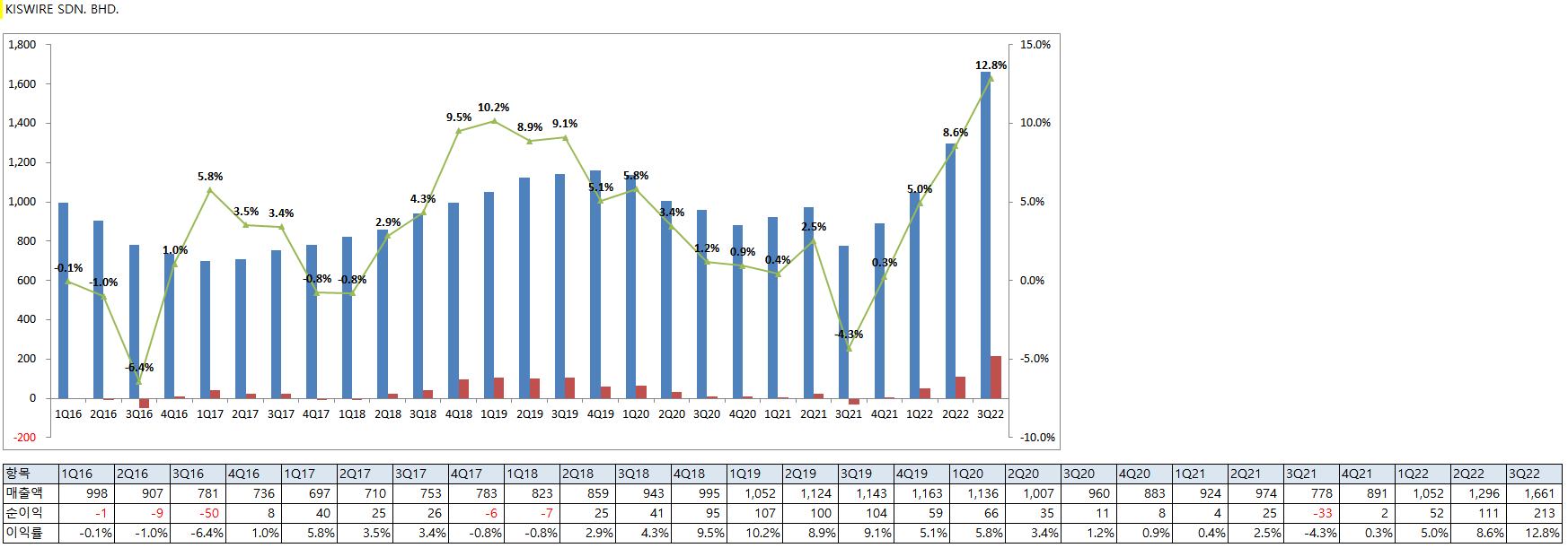 선재를 취급하는 법인 KISWIRE CORD SDN. BHD. 의 수익성 차이를 확인할 수 있습니다.