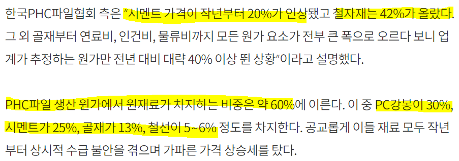 원재료 가격이 많이 올랐는데 PHC파일 가격 상승률은 그에 못미치는 게 아닌가 싶지만, 이에 대한 힌트는 상기의 뉴스 기사 안에 들어있습니다. 원재료 종류별 가격 상승률이 달랐고, 각각의 생산원가 상 비중이 다르며, 전체 생산원가에서 원재료가 차지하는 비중이 60~70% 정도이기 때문에 제품가격을 저 정도 인상하면 마진율 보전이 어느 정도 가능하다고 판단한 것으로 보입니다.