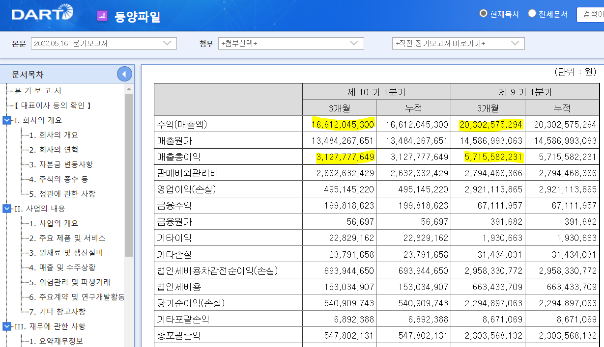 매출이 22억원 정도 늘어났고 매출원가는 80억원 정도 늘어났습니다. 1Q22 GPM이 8.3%로 YoY 절반도 못미치는 수준 입니다. 경쟁사 동양파일은 어떤지 보겠습니다.
