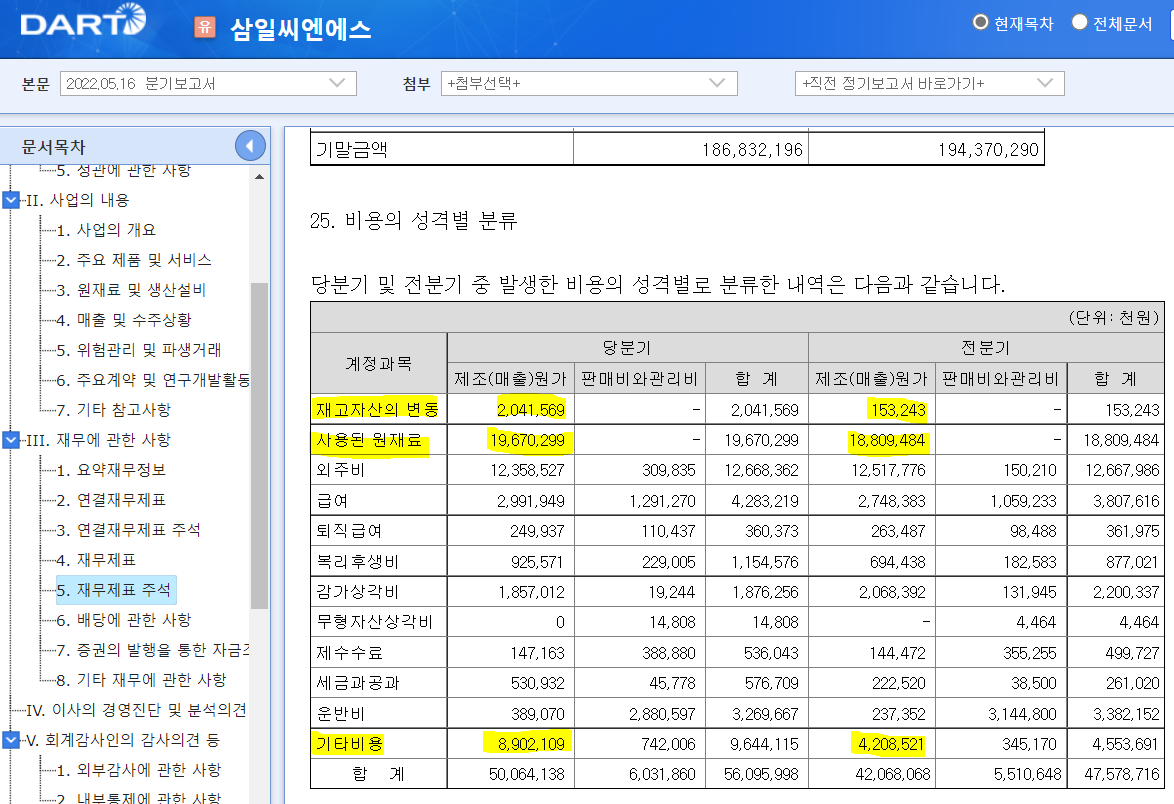 그럼 이제 삼일씨엔에스의 매출원가를 좀 더 자세히 보겠습니다.