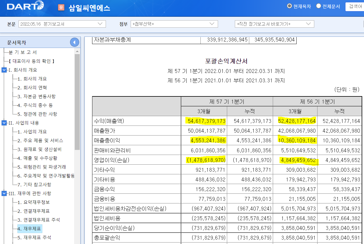 이에 따라 삼일씨엔에스의 1Q22 영업이익은 적자로 돌아서고 말았습니다. 연결이나 별도나 실적 차이가 크지 않으니 별도 재무제표를 보겠습니다.