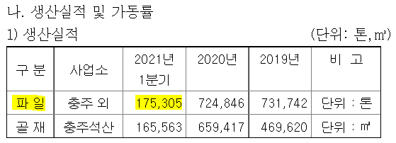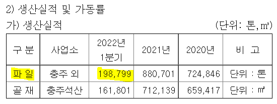 한편, 사용된 원재료는 YoY 9억원 증가했습니다. 1Q21 기준 사용된 원재료가 188억원이었으니 YoY 9억원 증가는 비율로 따지면 5% 정도 늘어난 수치 입니다. 시멘트 등의 원재료 가격은 20% 정도 올랐었는데 어째서 사용된 원재료는 이거 밖에 안올랐을까요? 생산량을 확인해봤습니다.