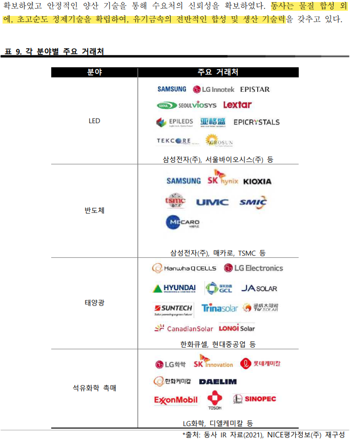 동사는 아무나 만들지 못하는 제품을, 그것도 다양한 형태로 만들고 있어 대형 거래처를 다수 확보하고 있습니다. 반도체 부문만 봐도 왠만한 대형사와는 다 거래하고 있음을 확인할 수 있습니다. 마이크론이 안보이긴 합니다만 아마 물리적 거리가 있어서 그런 거 겠지요.