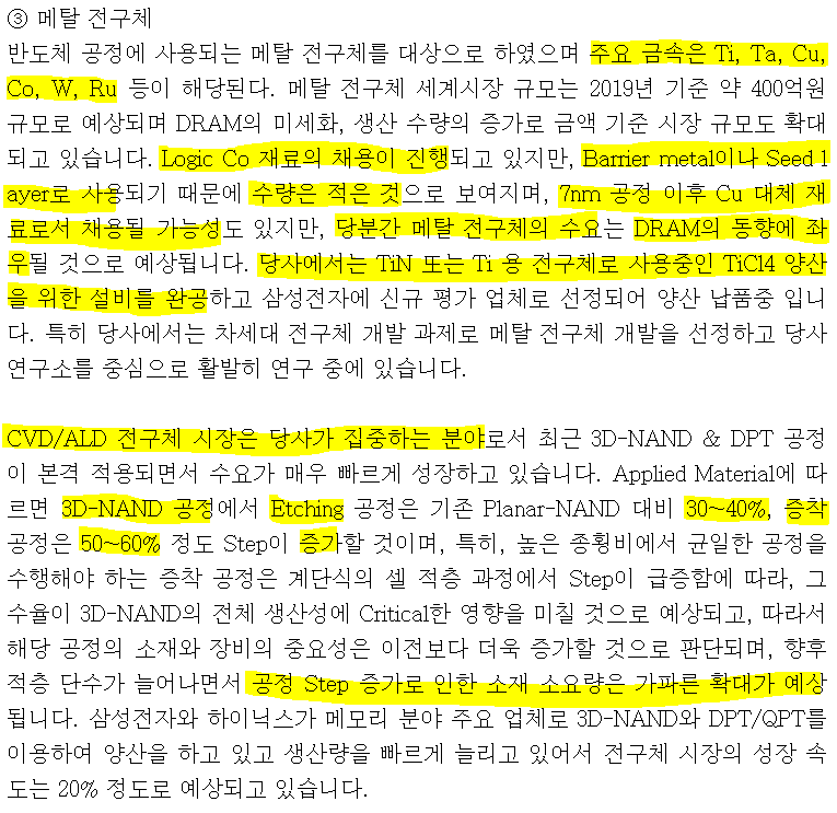 메탈 전구체는 D램 쪽으로는 수요가 확대되고 있고, 로직반도체 쪽으로는 사용량이 많지 않다는 내용이 있군요. CVD/ALD 전구체 시장은 낸드플래시 고단화에 따라 식각, 증착 공정 스텝이 증가하고, 이에 따라 전구체 사용량이 늘어날 것이라고 합니다. 여기까지는 좋은데 먹거리가 많아지니 경쟁사가 늘어난다는 점이 함정... 이건 2편에서 다루겠습니다.