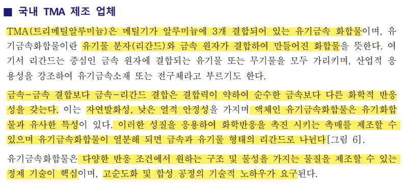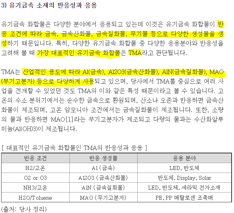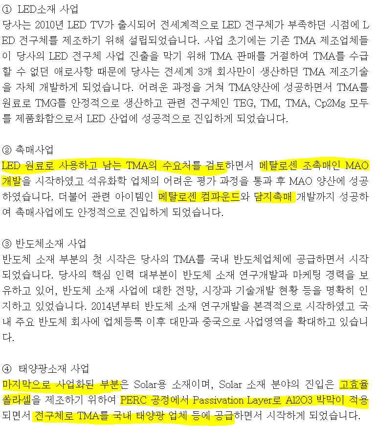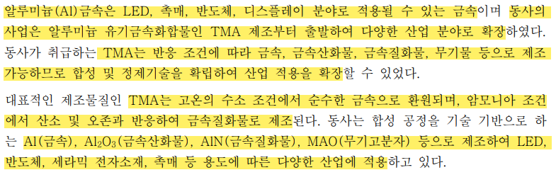 동사가 취급하는 금속 원소가 알루미늄에 국한되어있지 않다는 얘기군요. 다음 단락에서는 제조기술에 있어서 TMA가 출발점이 되었고, 이를 지속 확장하고 있다는 얘기가 나옵니다.