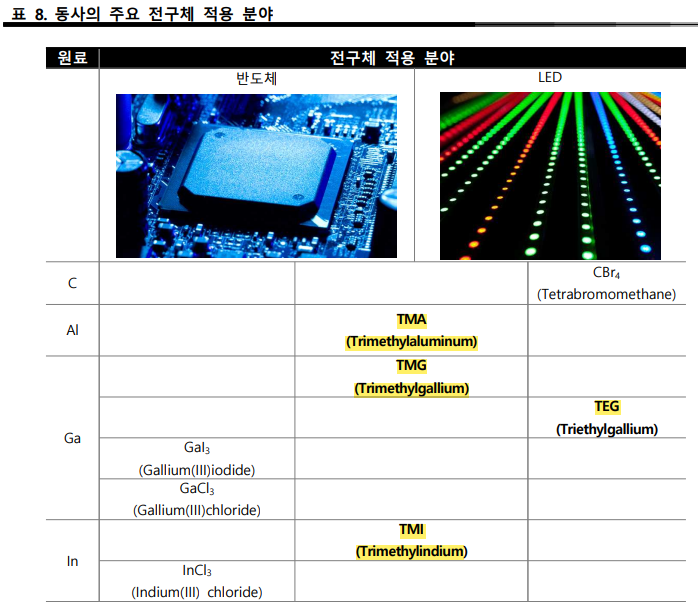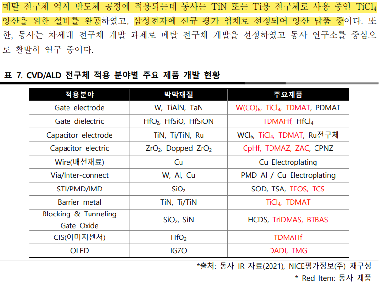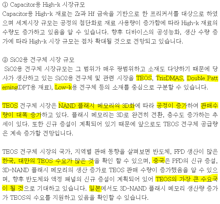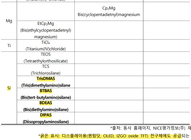 그 다음으로는 반도체 산업 리포트에서 흔히 나오는 High-k, 증착 공정에 대한 얘기도 나옵니다. High-k 박막 소재와 CVD/ALD 전구체를 개발 및 판매하고 있으며, 커패시터용 고유전율 재료, 실리카용 전구체도 판매하고 있다고 합니다. 저는 TMA = 전구체 공통 원재료 정도 되는 거라고 막연히 생각하고 있었는데 그게 전혀 아니었네요. 아래에 있는 표7 을 보면 전구체 종류 자체도 다양하고, 적지 않은 영역을 커버하고 있음을 확인할 수 있습니다.