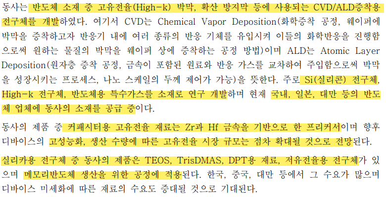 전구체 종류에 대한 상세설명이 나온 김에 (위 내용에서 요약으로 이미 다루었지만) 실리카(Si) 반도체와 메탈전구체에 대해서는 공시자료 상의 심층 내용을 더 보겠습니다.