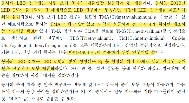 다음 단락에서는 동사가 TMA 제조기술을 개발하게 된 동기도 다루고 있습니다. 대표자가 '01년 디엔에프를 공동 창업하여 부사장으로 있다가 '10년에 동사를 설립했는데, TMA 수급이 어렵던 차에 개발을 할 수 있겠다 싶어 재창업을 한 것으로 보입니다. 제조기술 개발 후에도 그게 끝이 아니었고, 다양한 소재로 뻗어나갈 수 있는 출발점이 되었네요. 마이크로LED 쪽도 준비하고 있다니 기대됩니다 :)