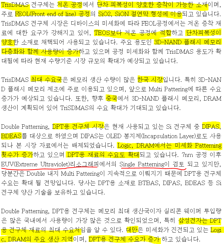 Si 원료로 만든 전구체 중 TEOS는 낸드플래시 고단화 추세에 따라 수요가 증가하고 있다는 내용이군요. 그 다음은 TrisDMAS, DPT 전구체 내용을 보겠습니다.