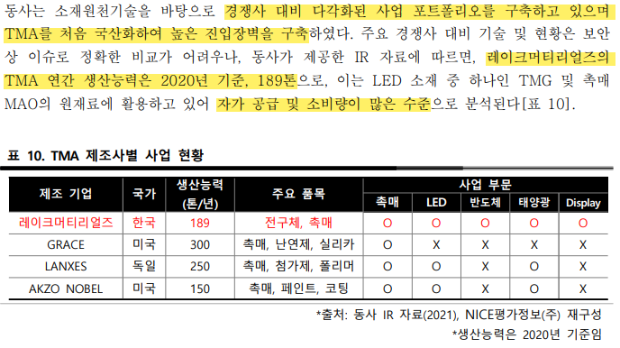 TMA 경쟁사 현황은 다음과 같습니다. '20년 생산능력 기준 동사가 3위 업체이고, 커버 가능한 사업 영역이 가장 넓은 것으로 나오네요. 그러나 기술의 깊이에 있어 어느 정도 차이가 있는지 알 수 없고, 다루는 품목이 서로 다르므로 참고만 해야할 것 같습니다.