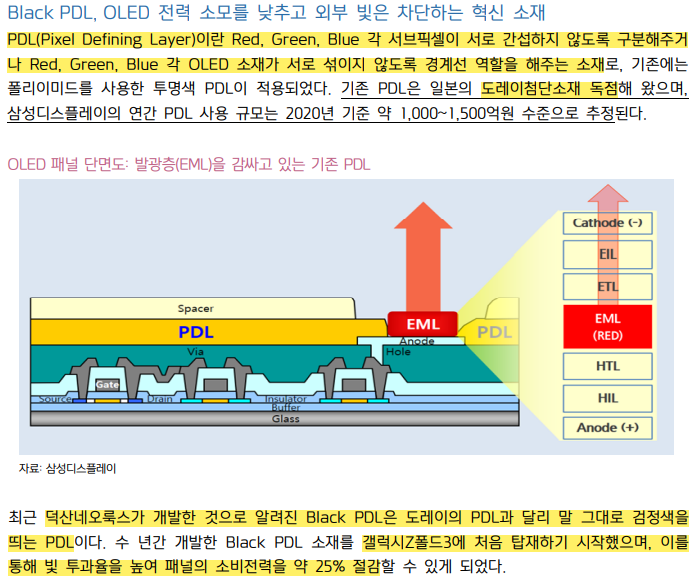 PDL은 EML의 R, G, B 가 서로 섞이지 않게 하는 경계선 역할을 합니다. 폴리이미드(PI)로 만드는데, 이게 도레이첨단소재 독점이고 삼성디스플레이가 연간 1,000~1,500억원 어치 물량을 사용했다고 합니다.