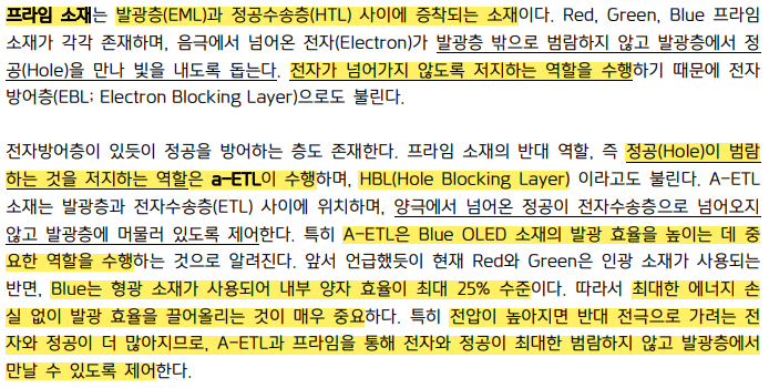 위에 있는 OLED 소재 구조 그림을 보면 EML을 이루는 색상별 호스트와 도펀트의 결합체 밑에 색상별 프라임이 깔려있는 게 보입니다. 프라임 소재는 EML과 HTL 사이에 위치하며 EML에 들어온 전자가 밖으로 못나가게 저지하는 역할을 수행합니다.