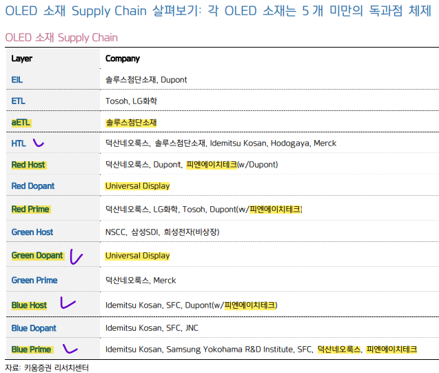 이제 서플라이 체인을 확인해보겠습니다. 각 소재별로 소수 업체가 독과점하고 있는데, ETL 소재를 다루는 국내업체는 피엔에이치테크(듀퐁과 협업)와 덕산네오룩스가 있습니다. 피엔에이치테크는 LGD 향이고, 덕산네오룩스는 삼성디스플레이 향 입니다.
