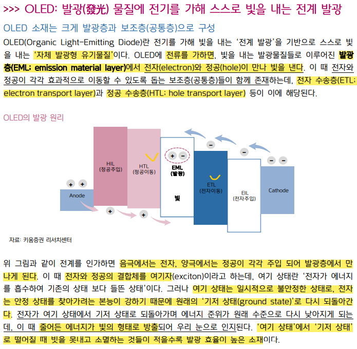 TV, 모바일 등 디스플레이가 탑재되는 소비재 수요 둔화가 진행 중이지만, OLED 로의 전환이라는 방향성은 그대로 이며, 이에 따라 전방산업의 수요 둔화에도 불구하고 OLED 소재에 대한 수요는 증가할 것으로 예상됩니다. 어려운 소재 이야기를 키움증권의 "한 권으로 끝내는 OLED 소재 기초설명서" (2021-09-09) 로 정리해보았습니다.